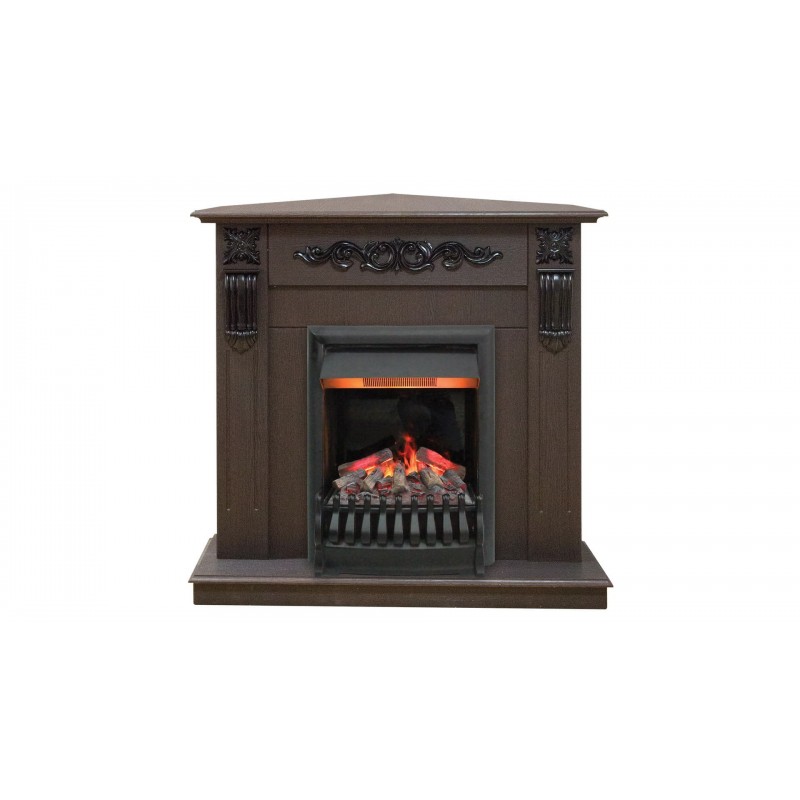 Угловой камин Dominica выполнен в теплом древесном оттенке с выразительными фактурными прожилками. Благодаря функции обогрева он не только станет дополнительным источником тепла в межсезонье, но и роскошной изюминкой интерьера. Сдержанную геометрию обрамления дополняют строгие колонны, главным украшением служит центральный объемный декор в виде оригинального растительного орнамента.