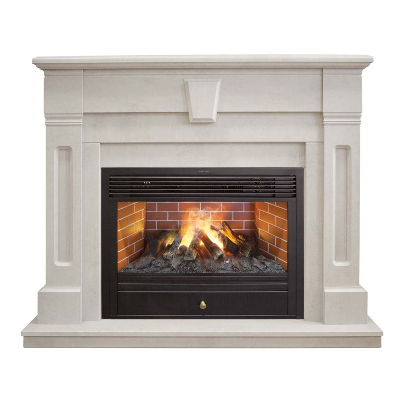 Новый каминокомплект очаг-электрокамин и портал Kellie исполнен в белом цвете старого камня. Цвет WTF-715 Представлен с очагом 3D Novara.