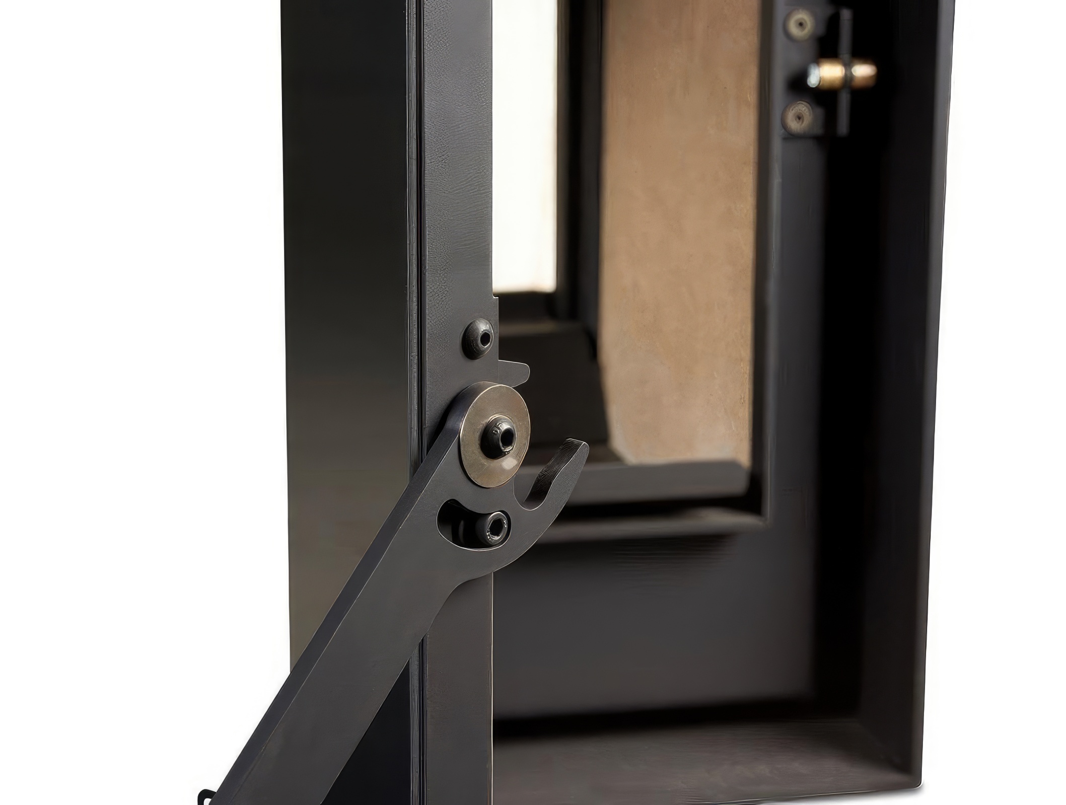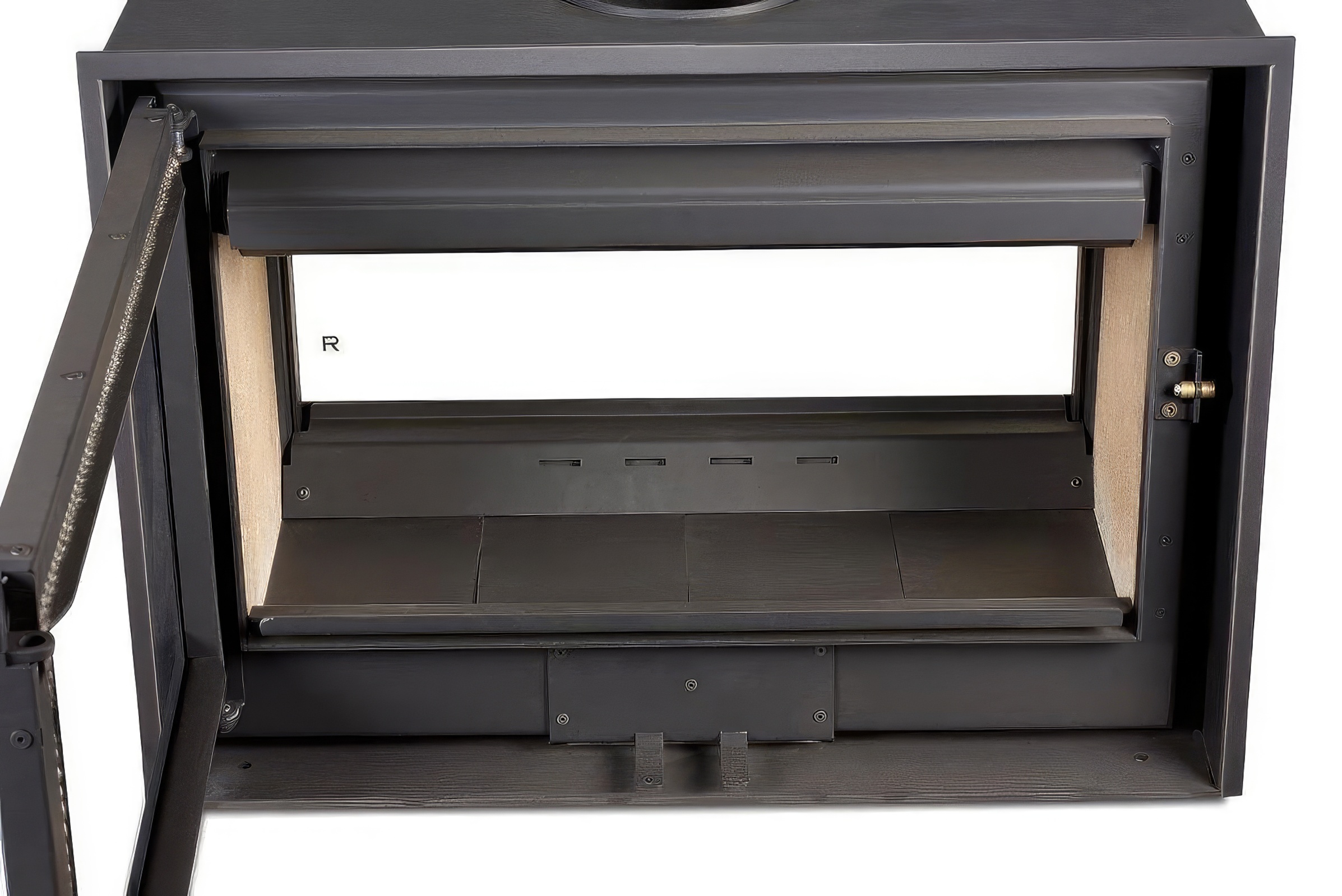 Топка оснащена системой самоочистки стекла (чистое стекло), вторичным дожигом газов, трехсторонней подачей воздуха (первичный, вторичный, третичный), зольником и возможностью подключения внешнего воздуха. Дополнительно: опция EControl для автоматического регулирования горения, встроенные вентиляторы для распределения тепла, охладитель дыма и отсутствие шибера. Материалы обеспечивают длительное горение и экологичность (низкие выбросы).