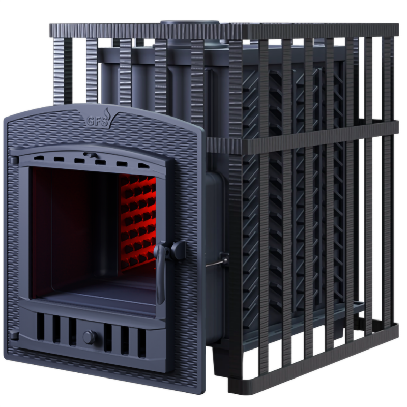Модель GFS Гефест ЗК 40 (П2) в сетке - печь с усиленной каменкой большей массы, с единым углублением внутрь топки для дополнительной укладки чугунного заряда. Теплосъемные шипы, со стороны горения пламени, в разы увеличивают площадь соприкосновения огня с каменкой и ускоряют передачу тепла, а также способствуют лучшему дожигу смешивая потоки пламени и воздуха, поступаемого из воздушника. Эти усовершенствования значительно повышают мощность парообразования печи и выдают большее количество пара при непрерывной подаче воды. Каменка печей GFS Гефест-ЗК является незаливаемой.