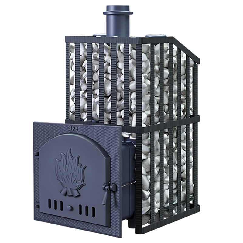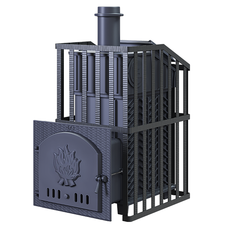 GFS Гефест ЗК Ураган 40 - расширенный комплект печи GFS Гефест ЗК в сетке. Максимально приближенный вариант печи для режимов русской парной, имеющий непосредственно закрытую чугунным коробом каменку, дверцу для пара с ручкой из бука, увеличенную до 50 см чугунную стартовую трубу. Печь легко модернизируется до полноценной печи предназначенной для Русской бани путем замены стальной сетки на каменную облицовку без демонтажа дымохода.