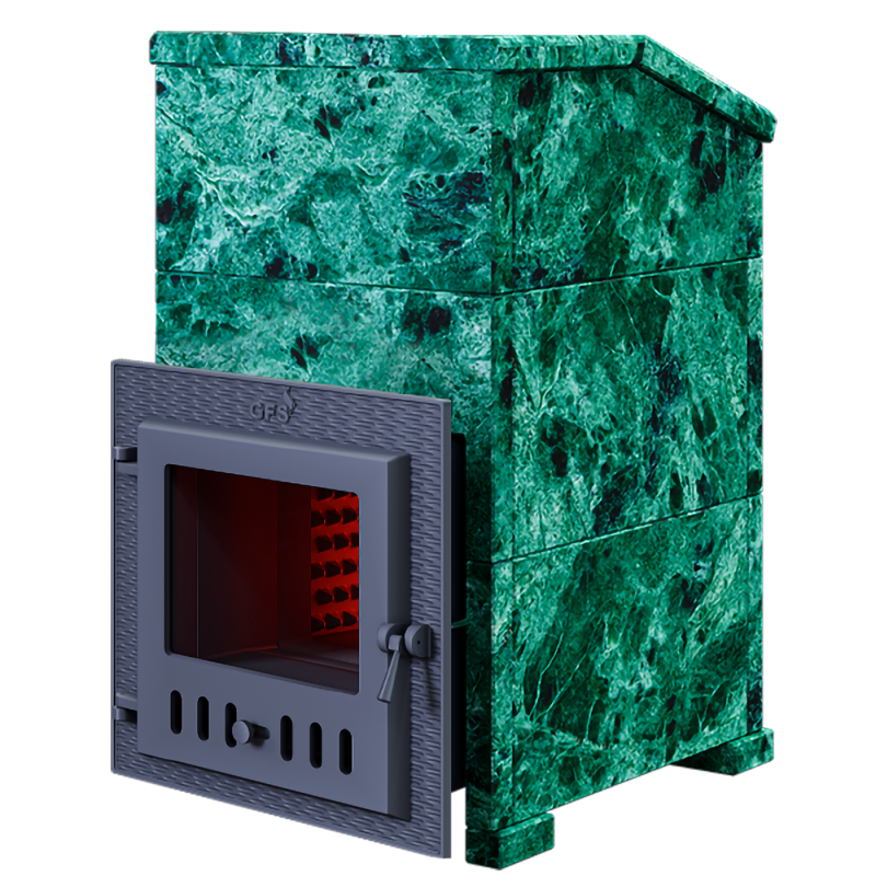 Комплект GFS Гефест ЗК 40(М) Президент 1130/40 Змеевик - печь с усиленной каменкой большей массы, с единым углублением внутрь топки для дополнительной укладки чугунного заряда. Теплосъемные шипы со стороны горения пламени в разы увеличивают площадь соприкосновения огня с каменкой и ускоряют передачу тепла, а также способствуют лучшему дожигу, смешивая потоки пламени и воздуха, поступаемого из воздушника. Эти усовершенствования значительно повышают мощность парообразования печи и выдают большее количество пара при непрерывной подаче воды. Каменка печей GFS Гефест-ЗК является незаливаемой.