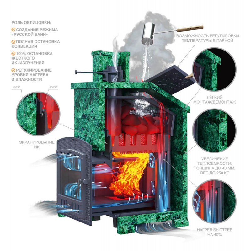 Не имеющая аналогов каменка толщиной 45 мм обеспечивает непревзойденную надежность и высокую теплоемкость, 120 теплосъемных шипов по всей её поверхности, позволяют каменке нагреться за 60 минут до 700 градусов и долгое время удерживать тепло.