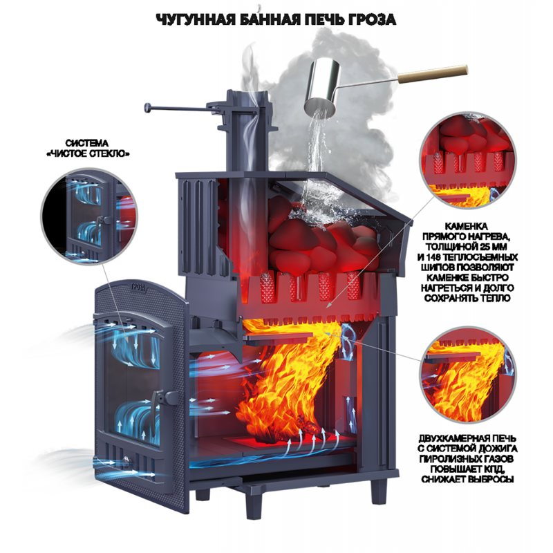 Чугунные банные печи GROZA — это современные печи, рассчитанные на малые и средние размеры парных. Печь имеет прочную сборную конструкцию, без резьбовых и сварных соединений, детали выполнены из легированного чугуна. Топка печей GROZA состоит из двух камер, разделенных пламегасителем. Радиаторные выступы каменки, направленные вглубь топки, увеличивают площадь контакта огня с каменкой и эффективность теплосъема.