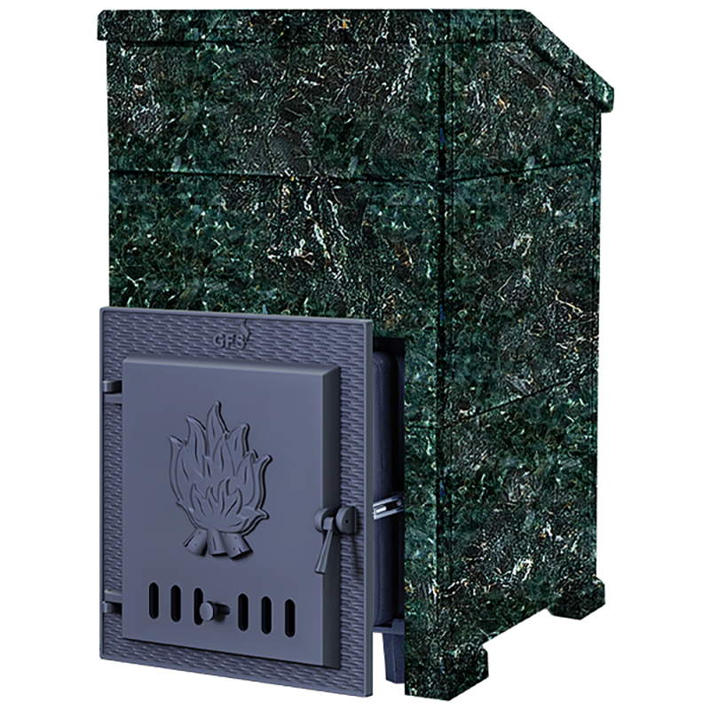 Комплект GFS Гефест ЗК 18 Президент 850/40 Серпентинит - печь с усиленной каменкой большей массы, с единым углублением внутрь топки для дополнительной укладки чугунного заряда. Теплосъемные шипы со стороны горения пламени в разы увеличивают площадь соприкосновения огня с каменкой и ускоряют передачу тепла, а также способствуют лучшему дожигу, смешивая потоки пламени и воздуха, поступаемого из воздушника. Эти усовершенствования значительно повышают мощность парообразования печи и выдают большее количество пара при непрерывной подаче воды. Каменка печей GFS Гефест-ЗК является незаливаемой.