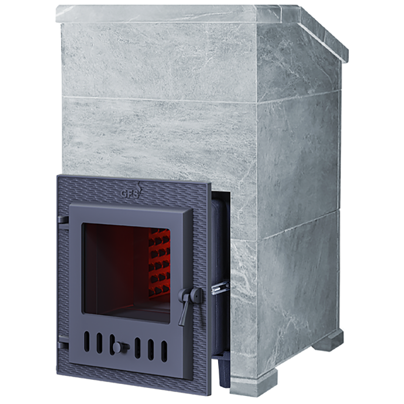 Комплект GFS Гефест ЗК 25(П)2 Президент 1000/40/50 Талькохлорит - печь с усиленной каменкой большей массы, с единым углублением внутрь топки для дополнительной укладки чугунного заряда. Теплосъемные шипы, со стороны горения пламени, в разы увеличивают площадь соприкосновения огня с каменкой и ускоряют передачу тепла, а также способствуют лучшему дожигу смешивая потоки пламени и воздуха поступаемого из воздушника. Эти усовершенствования значительно повышают мощность парообразования печи и выдают большее количество пара при непрерывной подаче воды. Каменка печей GFS Гефест-ЗК является незаливаемой.