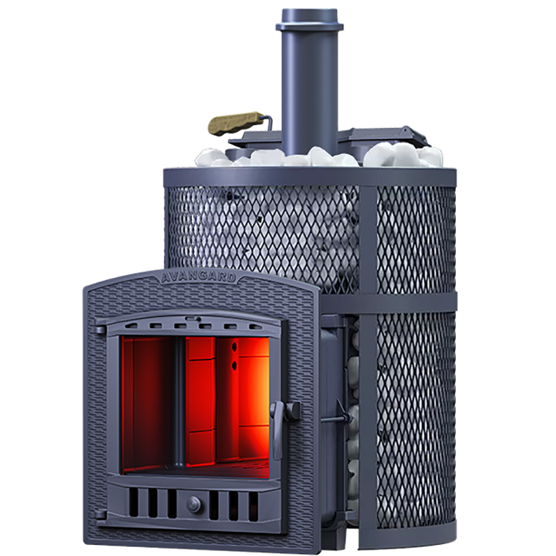Масса пароиспарителя в печи AVANGARD 51 кг, и он нагревается прямым контактом с пламенем. У пароиспарителя 2 поверхности с увеличенной рабочей площадью – снизу идёт нагрев огнём, а сверху поддаётся вода для пара. У печи уникальная, массивная каменка с теплонакопительными воронками, для получения легкого пара.