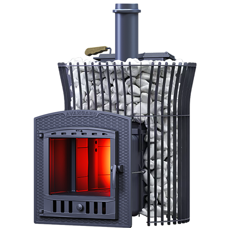 Масса пароиспарителя в печи AVANGARD 51 кг, и он нагревается прямым контактом с пламенем. У пароиспарителя 2 поверхности с увеличенной рабочей площадью – снизу идёт нагрев огнём, а сверху поддаётся вода для пара. У печи уникальная, массивная каменка с теплонакопительными воронками, для получения легкого пара.