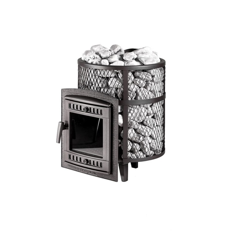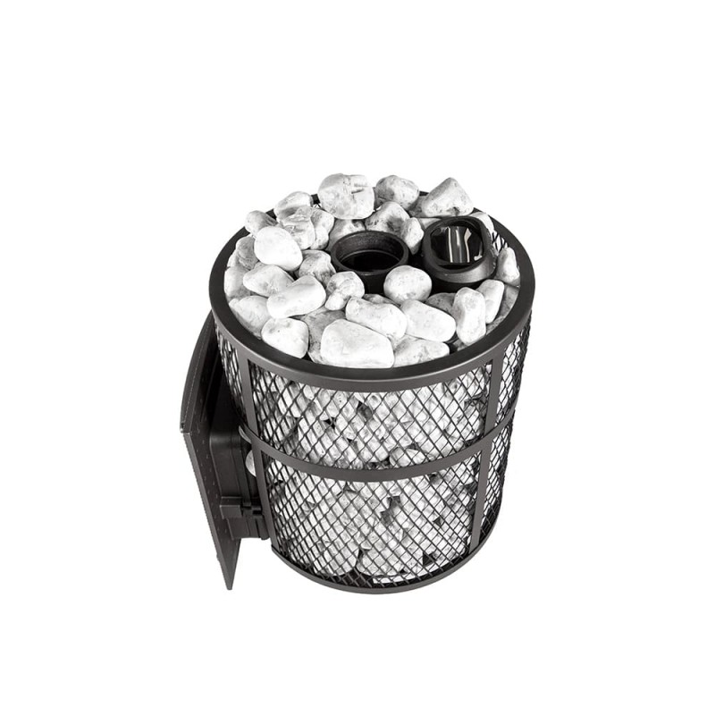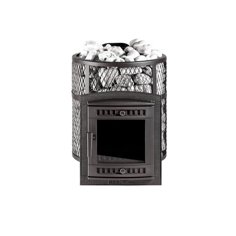 Кожух печи выполнен в виде сетки из стали и полностью заполняется природными камнями, обеспечивая высокую динамику нагрева парильного помещения.