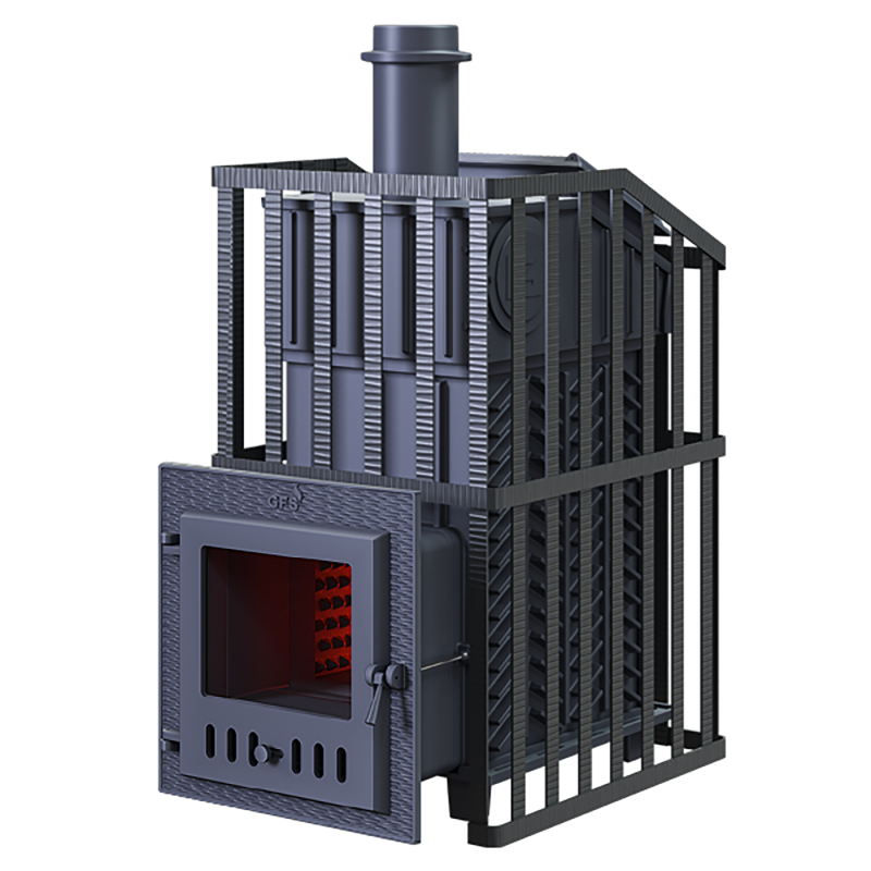 GFS Гефест ЗК Ураган 18 (М) - расширенный комплект печи GFS Гефест ЗК в сетке. Максимально приближенный вариант печи для режимов русской парной, имеющий непосредственно закрытую чугунным коробом каменку, дверцу для пара с ручкой из бука, увеличенную до 50 см чугунную стартовую трубу. Печь легко модернизируется до полноценной печи предназначенной для Русской бани путем замены стальной сетки на каменную облицовку без демонтажа дымохода.