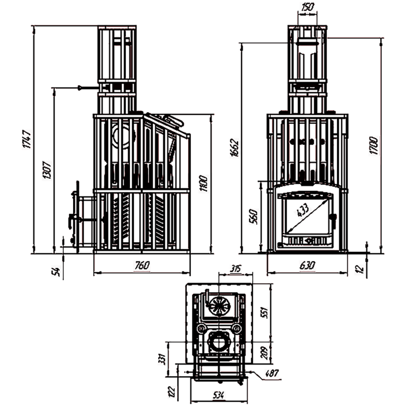 Печь легко модернизируется до полноценной печи предназначенной для Русской бани путем замены стальной сетки на каменную облицовку без демонтажа дымохода.