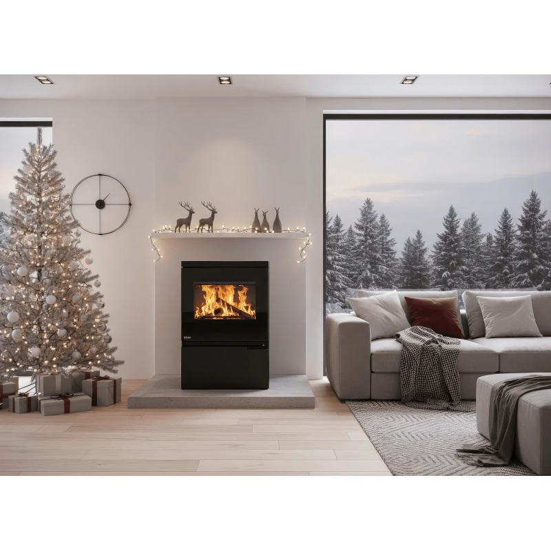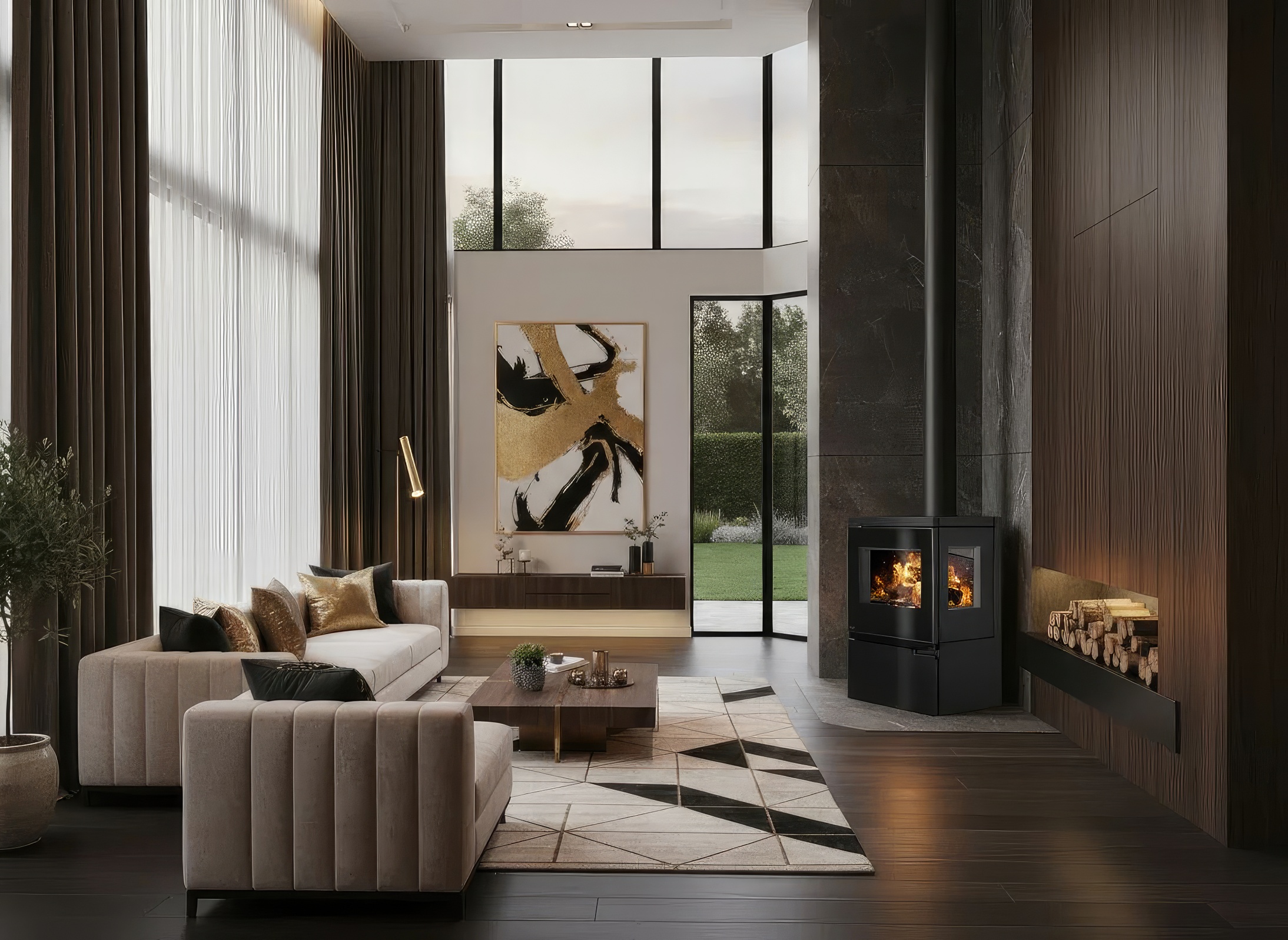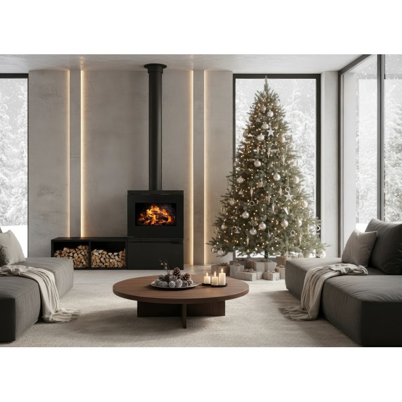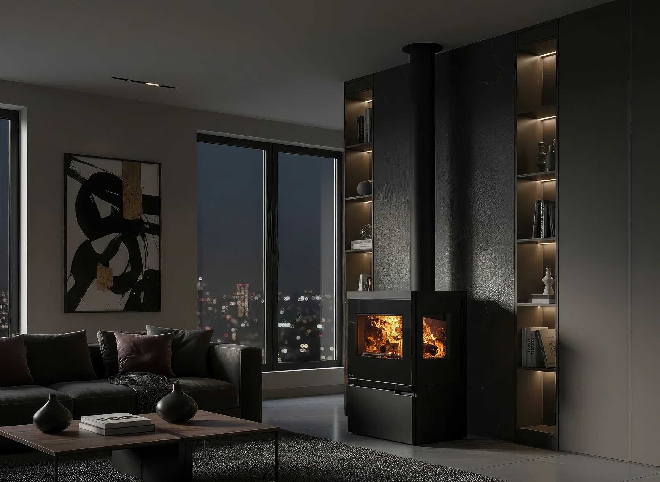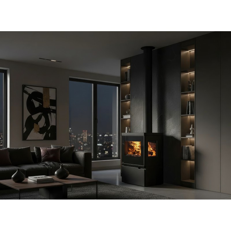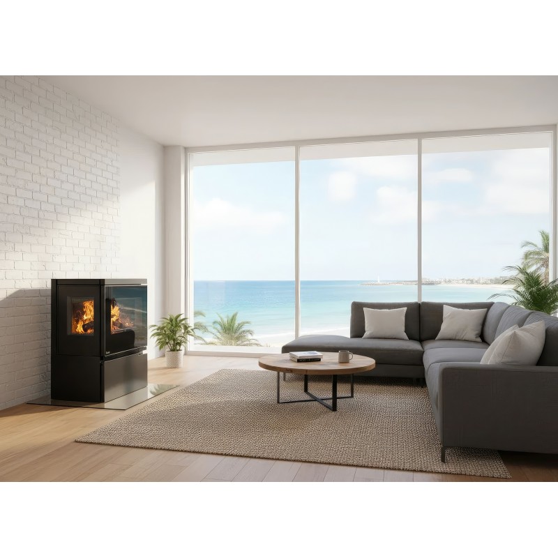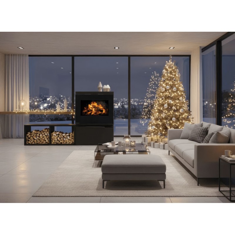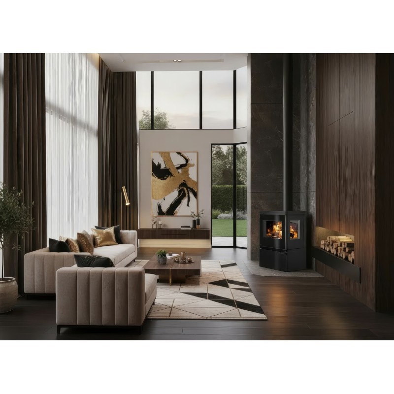 - Максимальный обзор огня: Широкое панорамное стекло с черной шелкографией позволяет детально наблюдать за игрой пламени, скрывая все внутренние механизмы дверцы.