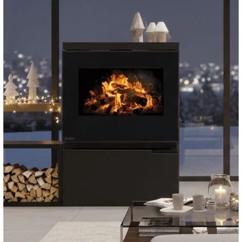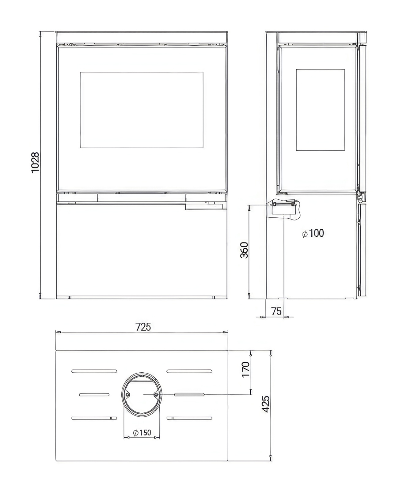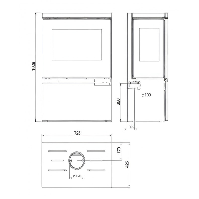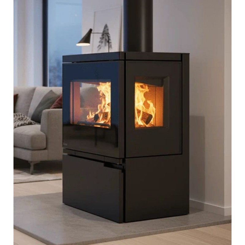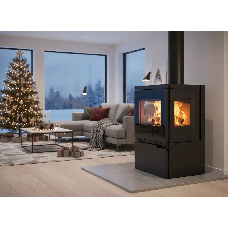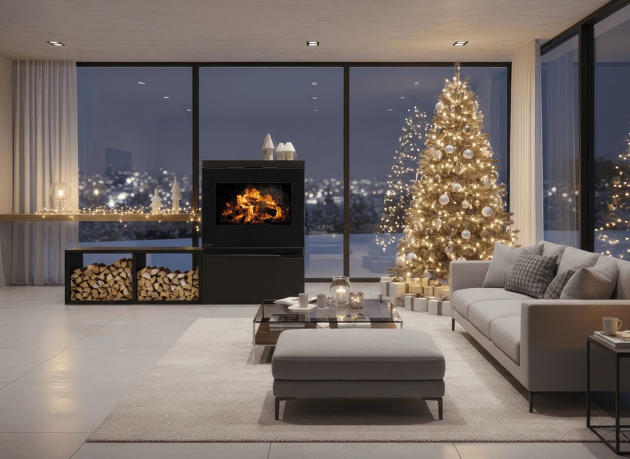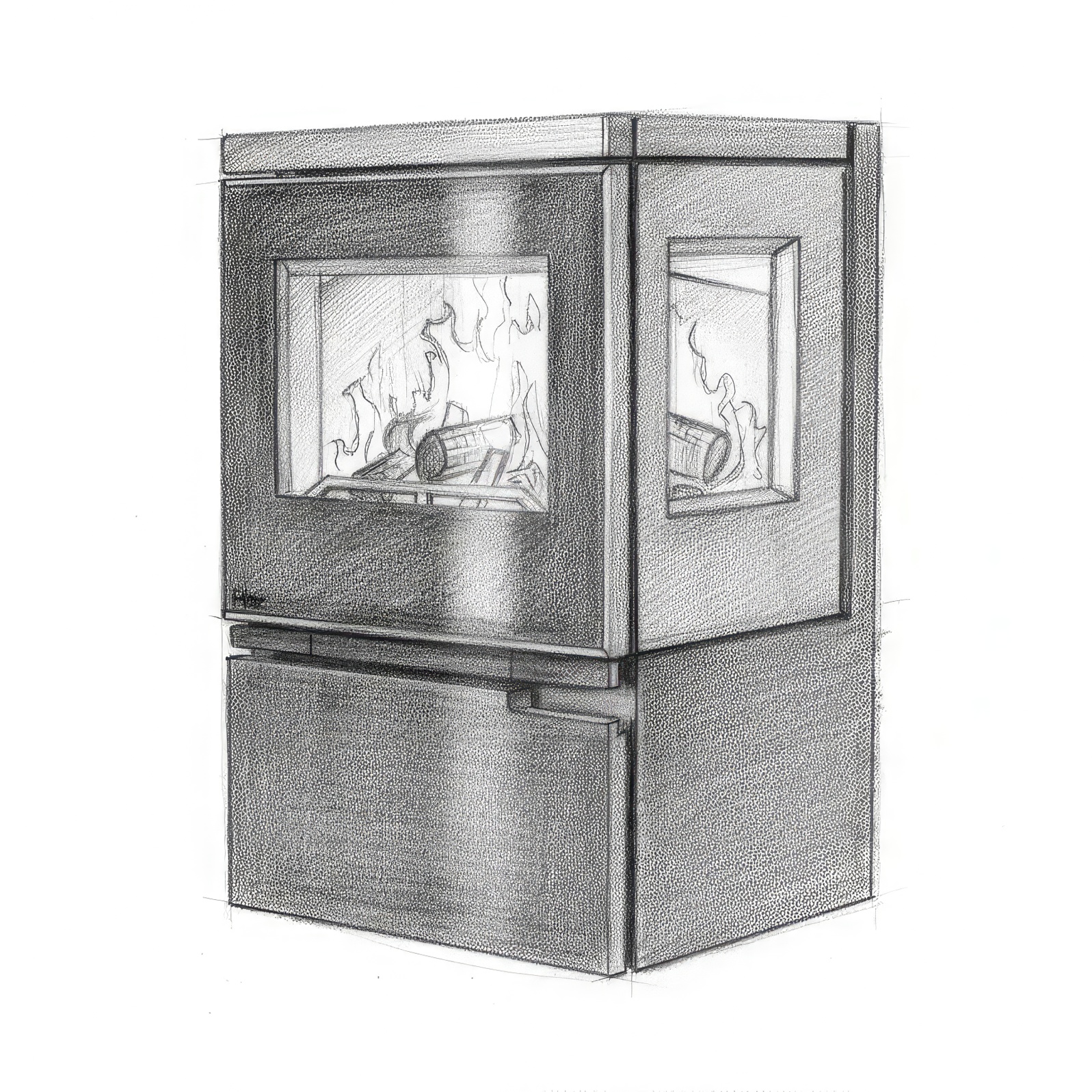 - Максимальный обзор огня: Широкое панорамное стекло с черной шелкографией позволяет детально наблюдать за игрой пламени, скрывая все внутренние механизмы дверцы.
