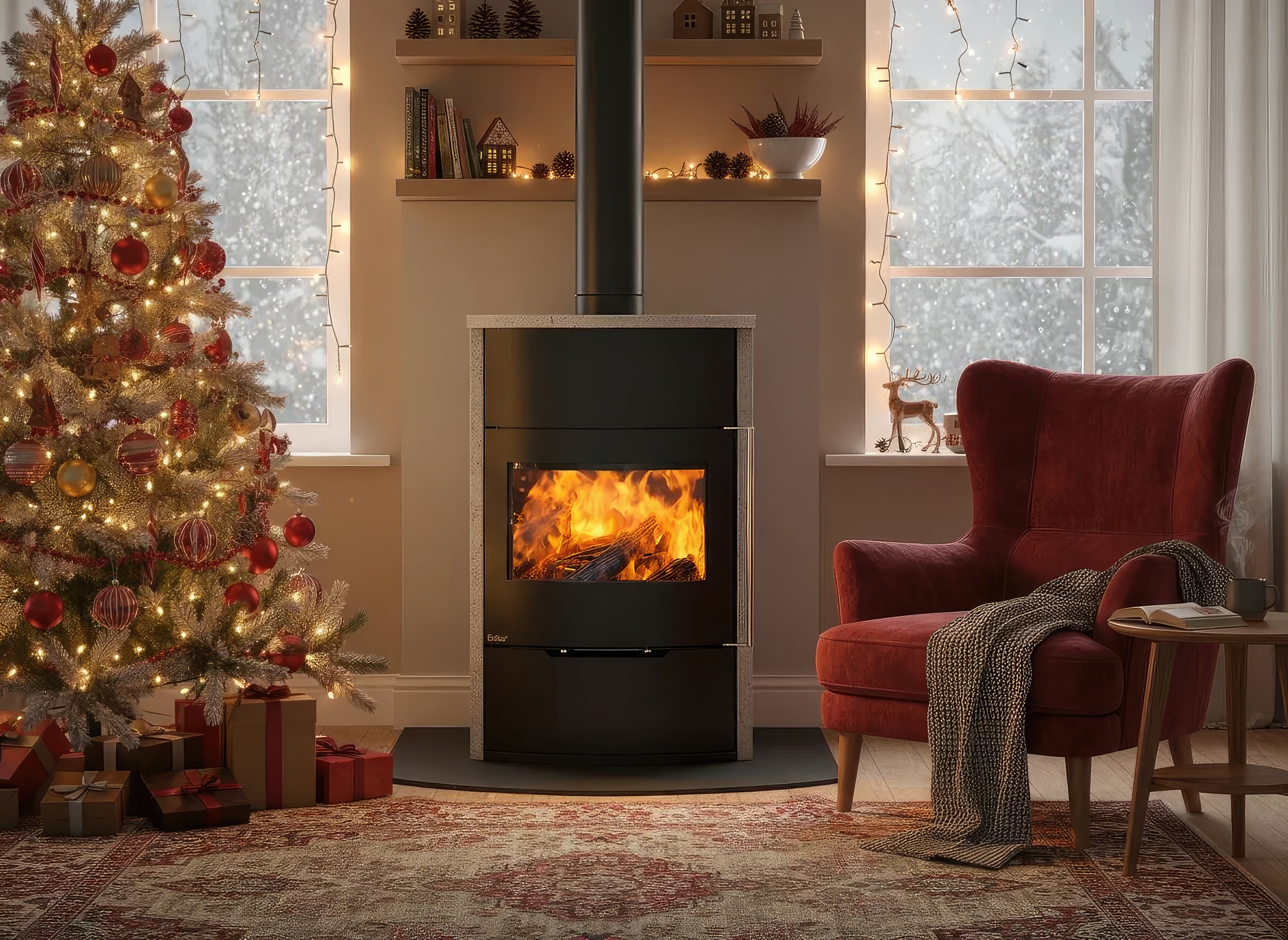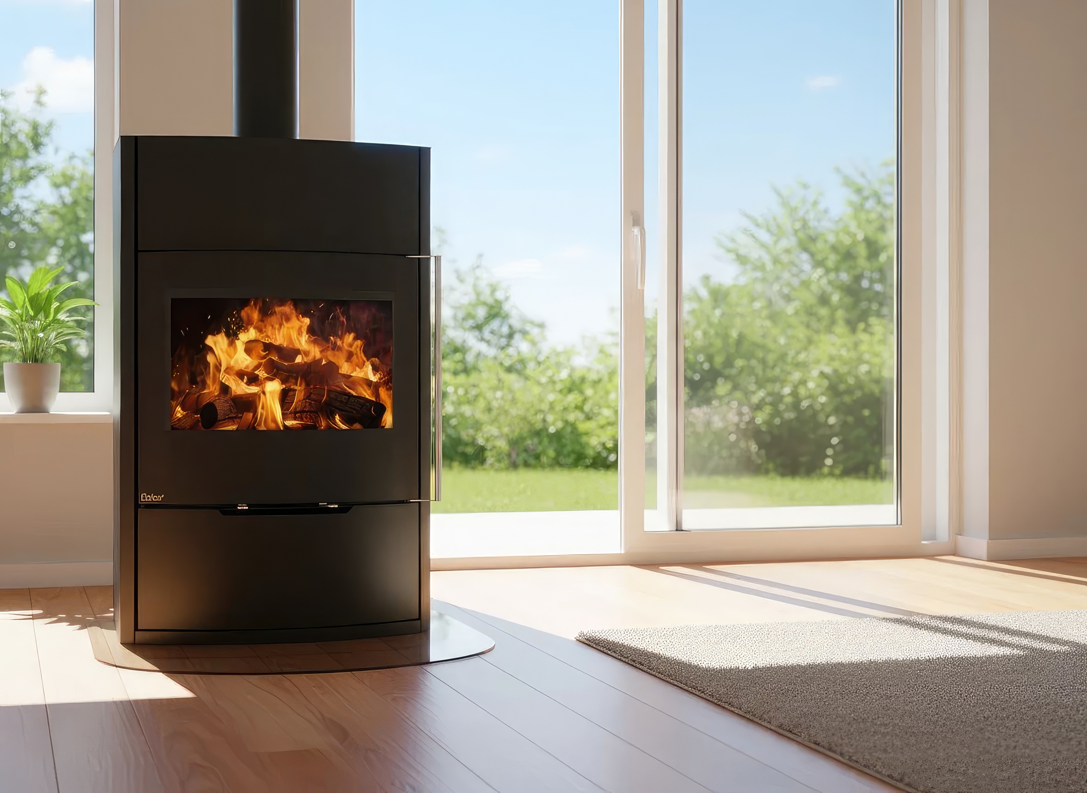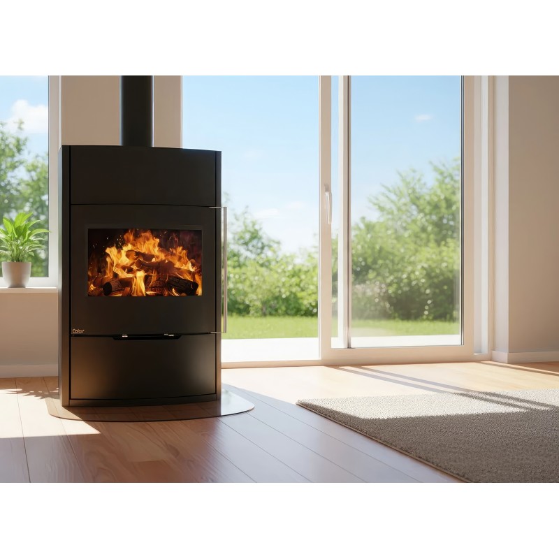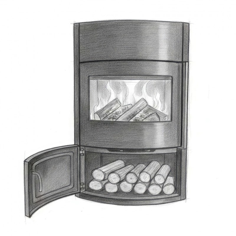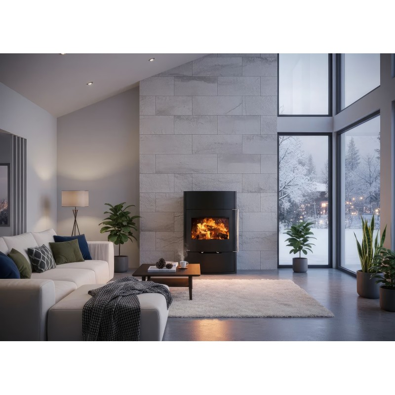 - Обзор 90 градусов: Угловое стекло Full Glass с черной шелкографией создает панорамный вид, визуально расширяя пространство топочной камеры.