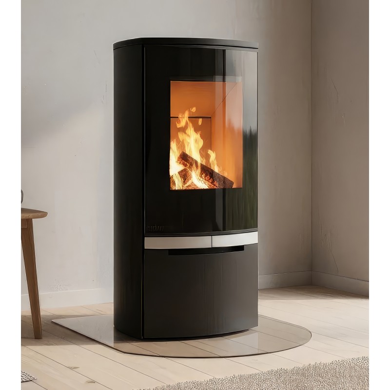 Внутренняя отделка выполнена из светлого вермикулита, который не только защищает сталь, но и за счет отражения тепла повышает температуру сгорания, делая пламя более ярким и чистым. Система «Чистое стекло» в модели U2 FG работает на обе стороны фасада, поддерживая прозрачность панорамного обзора даже при длительной топке.